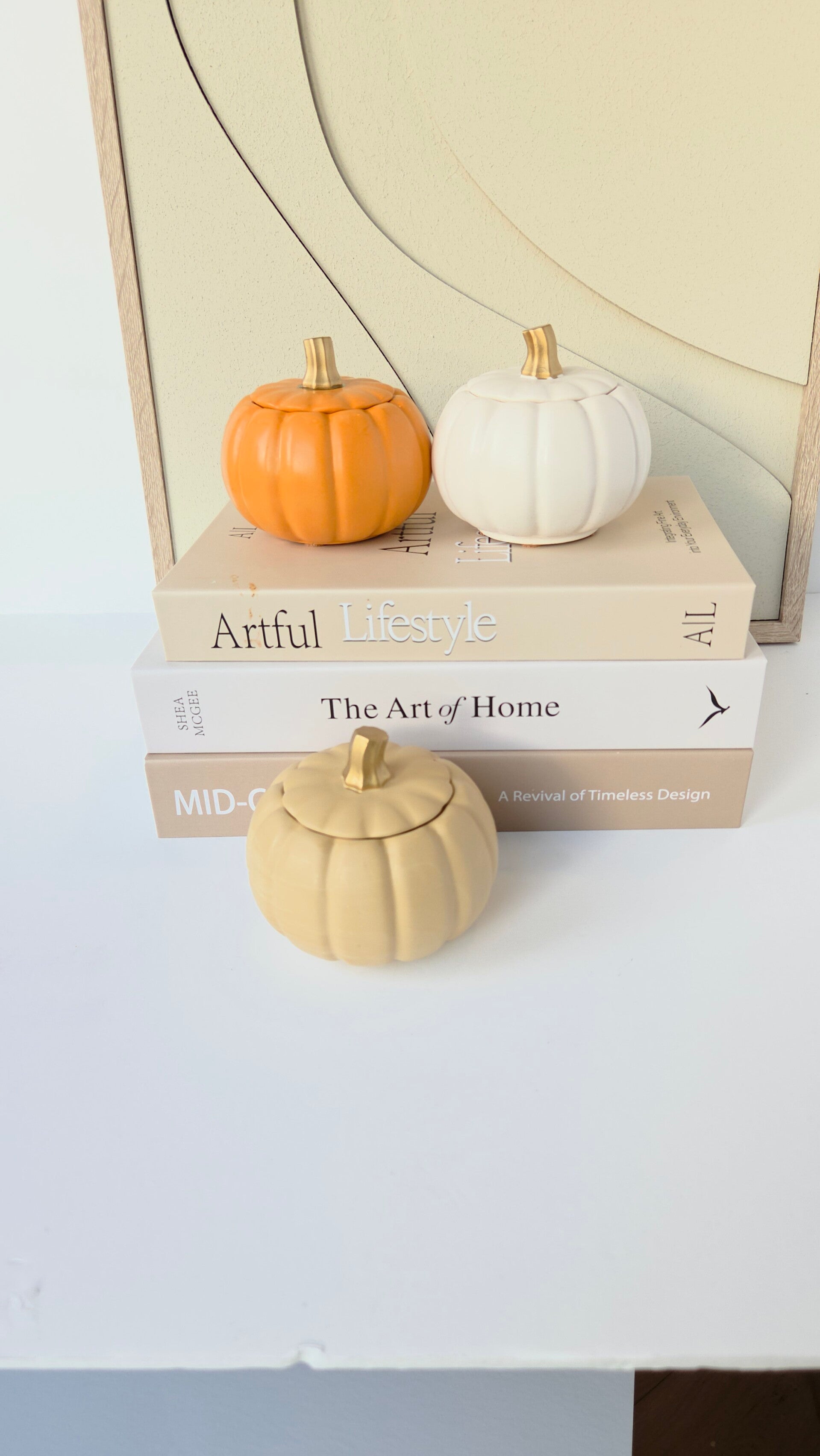De eerste keuze is gevallen op een pompoenpotje gevuld met een zoete en kruidige pumpkin spice geur.