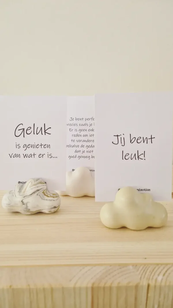 Breng je favoriete momenten tot leven met onze unieke Klein Geluk fotohouders. Elk houdertje is ontworpen in de vorm van een wolkje, hartje of bloem – een subtiele, speelse manier om je foto's of kaarten een mooi plekje te geven.
