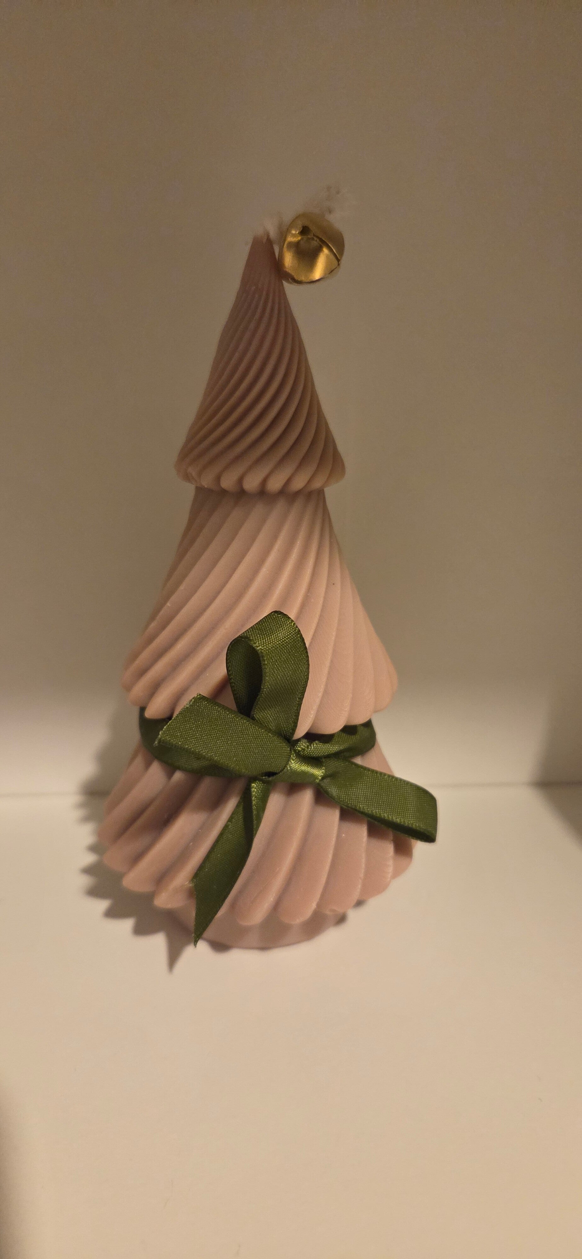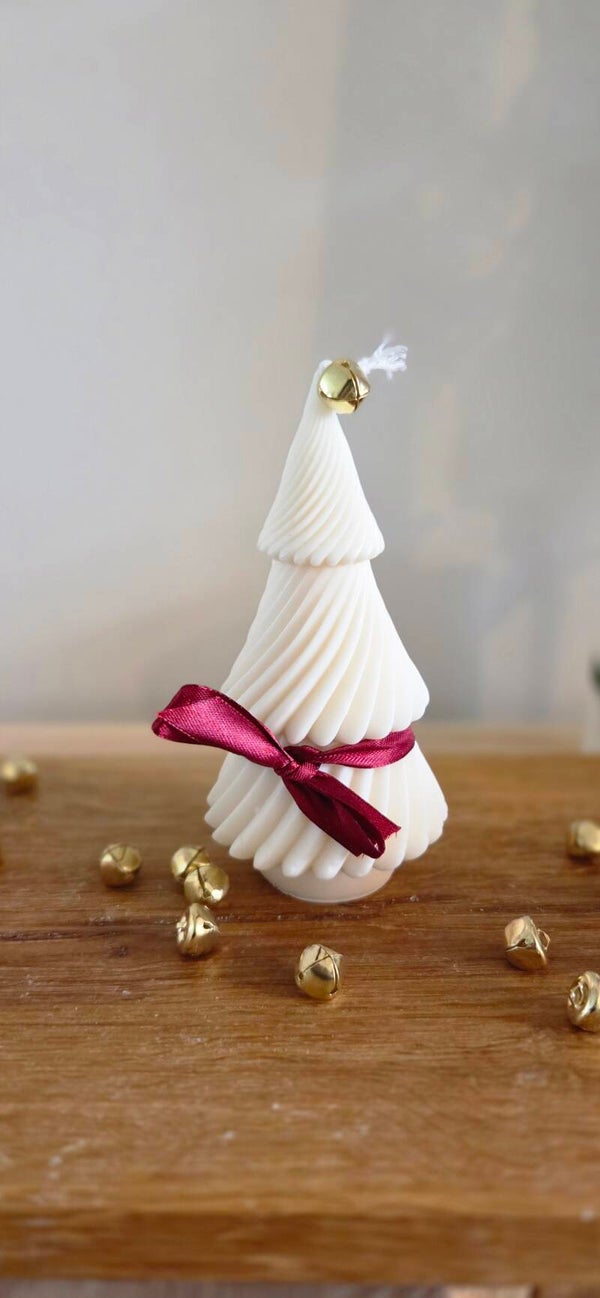 De elegante ribbels en het satijnen lint geven deze kerstboomkaars een luxe uitstraling.