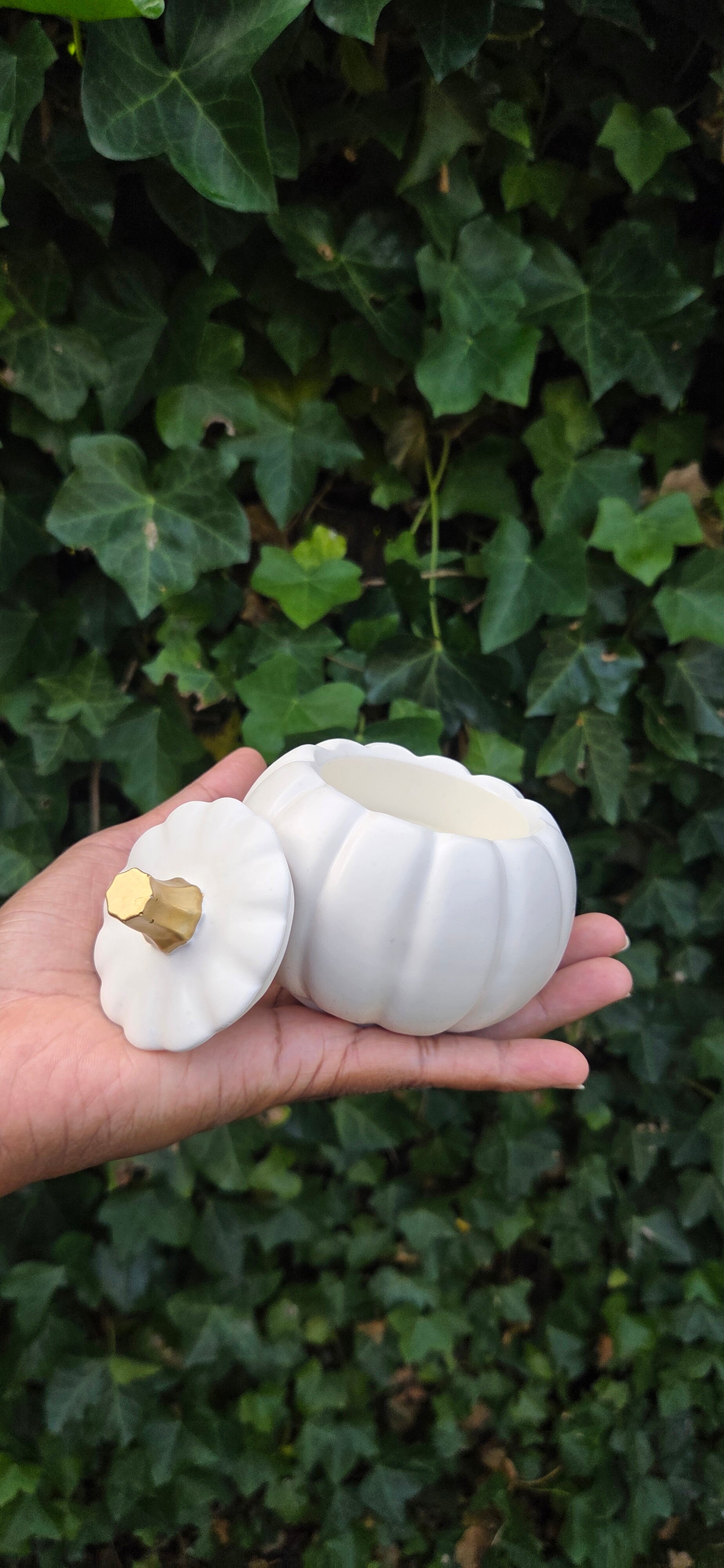 Pumpkin Spice kaars in een handgemaakte pompoenenpotje.